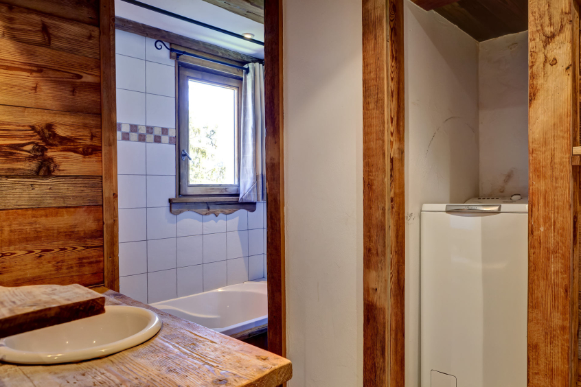 One bathroom with bath tub and washing machine and separated toilets.