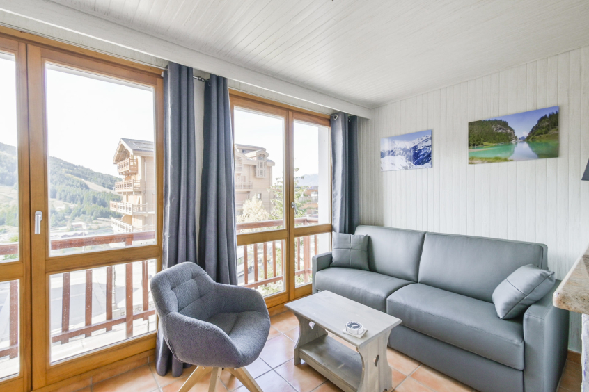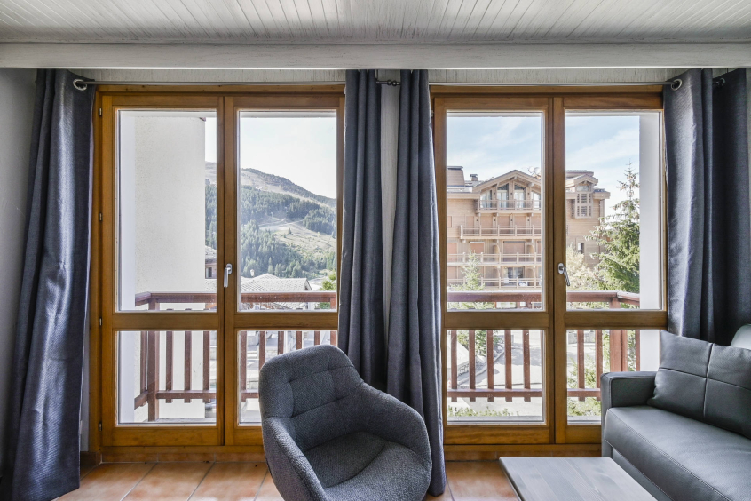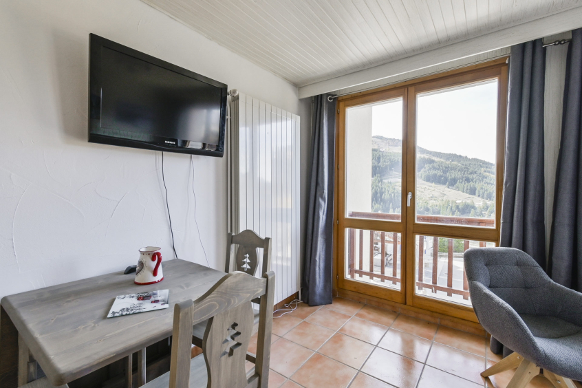 Living-area with bay windows leading to a small balcony exposed North-West with view on the mountains and on the ski slopes.