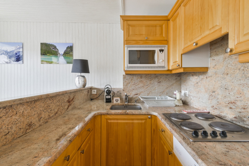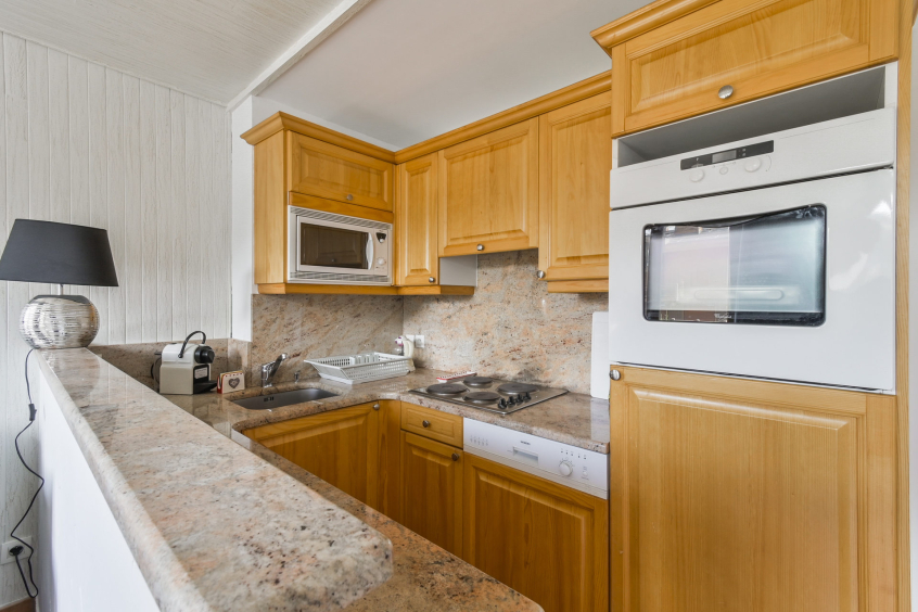 Open plan kitchen : combined microwave/oven, dishwasher, vitroceramic hobs, fridge, and cooking hobs.