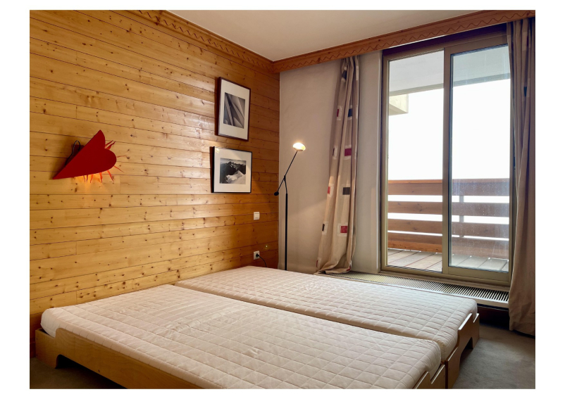 Living room with dining area and northeast-facing balcony with mountain views (Dent du Villard).