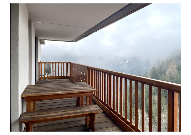 Living room with dining area and northeast-facing balcony with mountain views (Dent du Villard).
