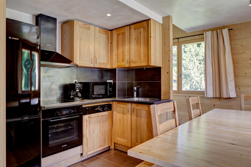 Cuisine ouverte sur le coin repas, entièrement équipée : four traditionnel, plaques vitrocéramiques, lave-vaisselle et micro-ondes.