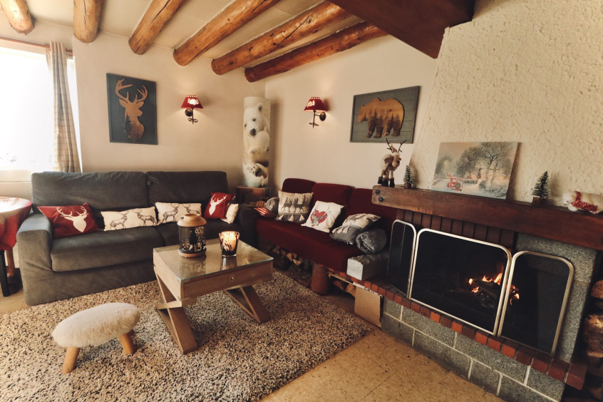 Séjour - Salle à manger avec magnifique vues sur la vallée exposée Nord-Est dispose d'une cheminée (foyer non fermé et bois à disposition sur place), avec 2 canapés et télévision.